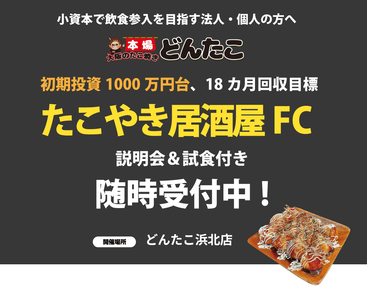 どんたこはお一人様からファミリー層、お年寄りまで老若男女問わず幅広くのお客様に親しまれているたこやき居酒屋です。お手頃でおいしい商品を提供することにこだわりっております。当社は独自のノウハウにより収益化を確かなものとする体制を構築し、お客様に満足して頂きながら、安定した収益を実現します。
